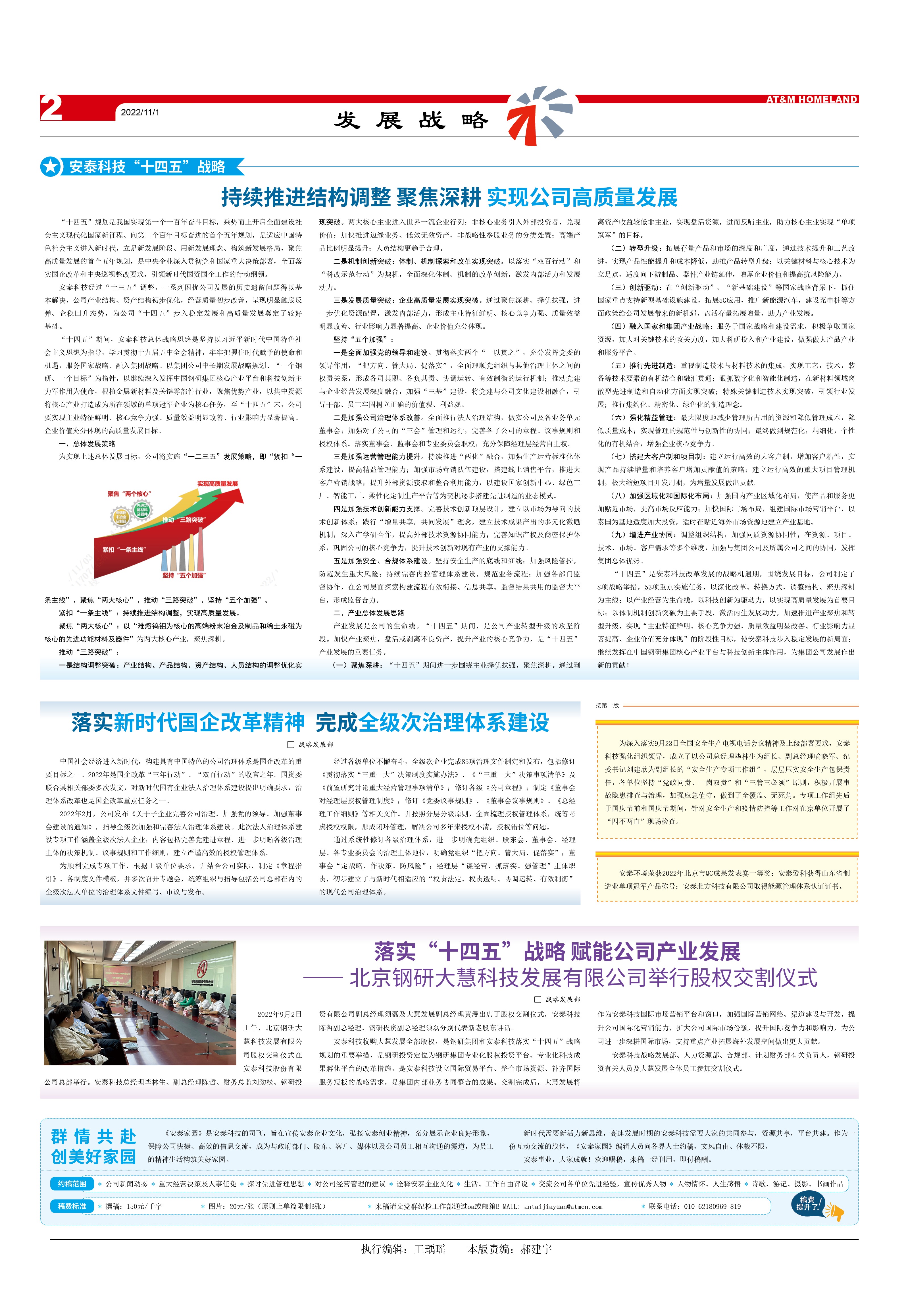 “十四五”是安泰科技改革發(fā)展的戰(zhàn)略機遇期,圍繞發(fā)展目標,公司制定了8項戰(zhàn)略舉措,53項重點實施任務,以深化改革、轉(zhuǎn)換方式、調(diào)整結(jié)構(gòu)、聚焦深耕為主線;以產(chǎn)業(yè)經(jīng)營為生命線,以科技創(chuàng)新為驅(qū)動力,以實現(xiàn)高質(zhì)量發(fā)展為首要目標;以體制機制創(chuàng)新突破為主要手段,激活內(nèi)生發(fā)展動力,加速推進產(chǎn)業(yè)聚焦和轉(zhuǎn)型升級,實現(xiàn)“主業(yè)特征鮮明、核心競爭力強、質(zhì)量效益明顯改善、行業(yè)影響力顯著提高、企業(yè)價值充分體現(xiàn)”的階段性目標,使安泰科技步入穩(wěn)定發(fā)展的新局面;繼續(xù)發(fā)揮在中國鋼研集團核心產(chǎn)業(yè)平臺與科技創(chuàng)新主體作用,為集團公司發(fā)展作出新的貢獻!