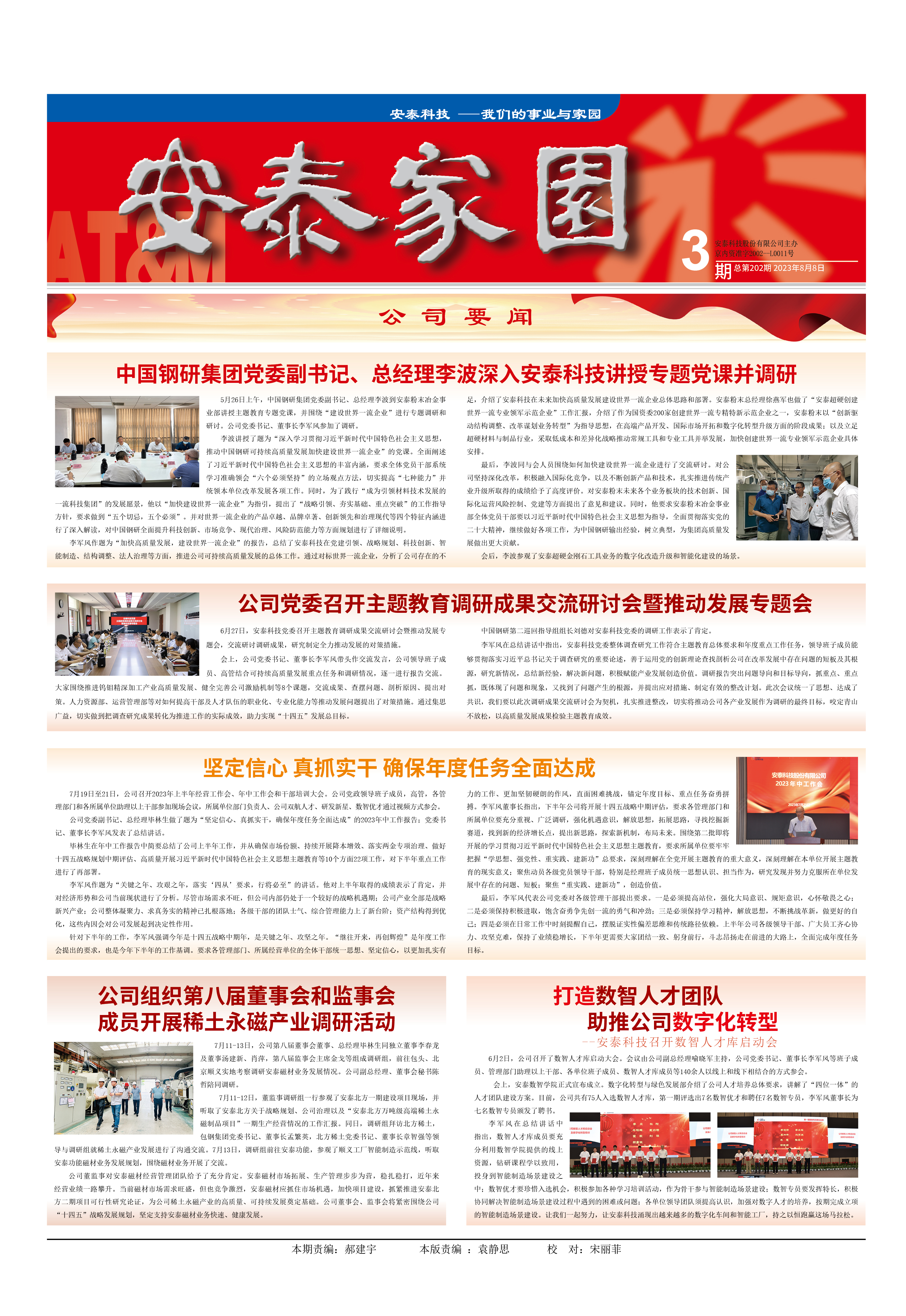 李波講授了題為“深入學(xué)習(xí)貫徹習(xí)近平新時(shí)代中國(guó)特色社會(huì)主義思想,推動(dòng)中國(guó)鋼研可持續(xù)高質(zhì)量發(fā)展加快建設(shè)世界一流企業(yè)”的黨課。全面闡述了習(xí)近平新時(shí)代中國(guó)特色社會(huì)主義思想的豐富內(nèi)涵,要求全體黨員干部系統(tǒng)學(xué)習(xí)準(zhǔn)確領(lǐng)會(huì)“六個(gè)必須堅(jiān)持”的立場(chǎng)觀點(diǎn)方法,切實(shí)提高“七種能力”并統(tǒng)領(lǐng)本單位改革發(fā)展各項(xiàng)工作。同時(shí),為了踐行“成為引領(lǐng)材料技術(shù)發(fā)展的一流科技集團(tuán)”的發(fā)展愿景,他以“加快建設(shè)世界一流企業(yè)”為指引,提出了“戰(zhàn)略引領(lǐng)、夯實(shí)基礎(chǔ)、重點(diǎn)突破”的工作指導(dǎo)方針,要求做到“五個(gè)切忌,五個(gè)必須”。并對(duì)世界一流企業(yè)的產(chǎn)品卓越、品牌卓著、創(chuàng)新領(lǐng)先和治理現(xiàn)代等四個(gè)特征內(nèi)涵進(jìn)行了深入解讀,對(duì)中國(guó)鋼研全面提升科技創(chuàng)新、市場(chǎng)競(jìng)爭(zhēng)、現(xiàn)代治理、風(fēng)險(xiǎn)防范能力等方面規(guī)劃進(jìn)行了詳細(xì)說(shuō)明。